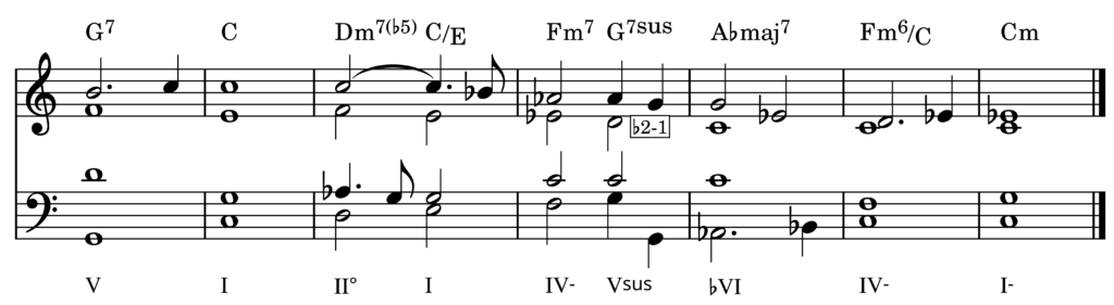 - La aparición de las notas ♭9 y ♭13 del dominante (que a su vez son ♭6 y ♭3 de Do menor, que es hacia donde queremos ir) es crucial para preparar la resolución a menor. La ♭9 aparece como apoyatura y la ♭13 como nota de paso.