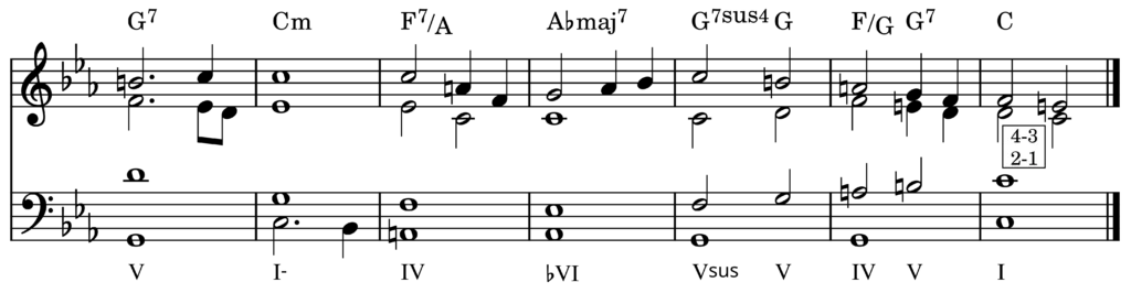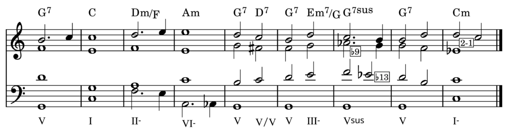 - Fíjate cómo, sobre el pedal de dominante, hemos utilizado el concepto de prolongación: primero con un D7, que es V/V, y luego con un Em7, que es un III grado. El hecho de que el D7 funcione sobre un bajo en Sol es únicamente gracias al pedal: la nota larga, en movimiento oblicuo con el resto, hace que las voces superiores se sientan como movimientos de paso.